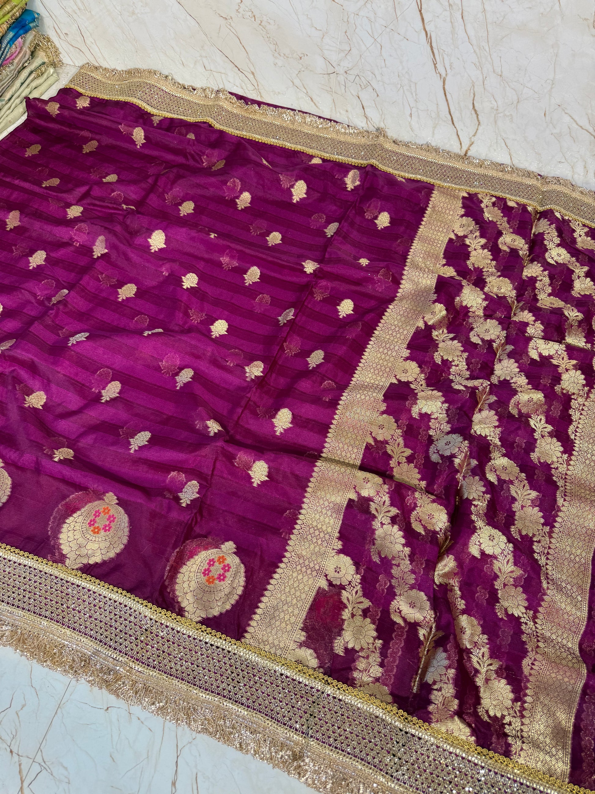 Banarasi sarees are traditional Indian sarees that are known for their luxurious fabric and intricate designs. They are made in the city of Varanasi, also known as Banaras, and are typically made from fine silk. The sarees can feature elaborate patterns woven with gold or silver threads, including floral designs, paisleys, and scenes from Hindu mythology. The craftsmanship of Banarasi sarees is considered to be some of the finest in the world, with many sarees taking weeks or even months to produce. Banarasi sarees are often considered to be a symbol of wealth and prestige, and are traditionally worn on special occasions such as weddings, festivals, and religious ceremonies. Their timeless elegance and intricate beauty make them a popular choice for both Indian and international audiences.