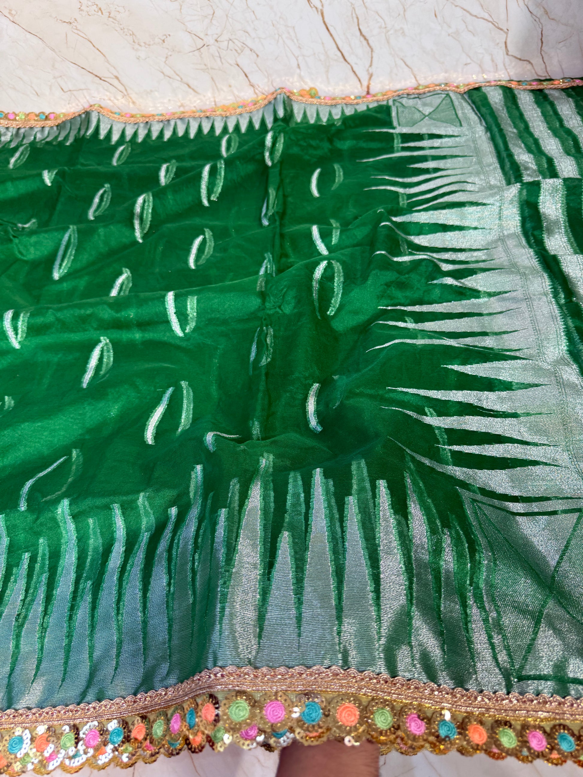 Banarasi sarees are traditional Indian sarees that are known for their luxurious fabric and intricate designs. They are made in the city of Varanasi, also known as Banaras, and are typically made from fine silk. The sarees can feature elaborate patterns woven with gold or silver threads, including floral designs, paisleys, and scenes from Hindu mythology. The craftsmanship of Banarasi sarees is considered to be some of the finest in the world, with many sarees taking weeks or even months to produce. Banarasi sarees are often considered to be a symbol of wealth and prestige, and are traditionally worn on special occasions such as weddings, festivals, and religious ceremonies. Their timeless elegance and intricate beauty make them a popular choice for both Indian and international audiences.