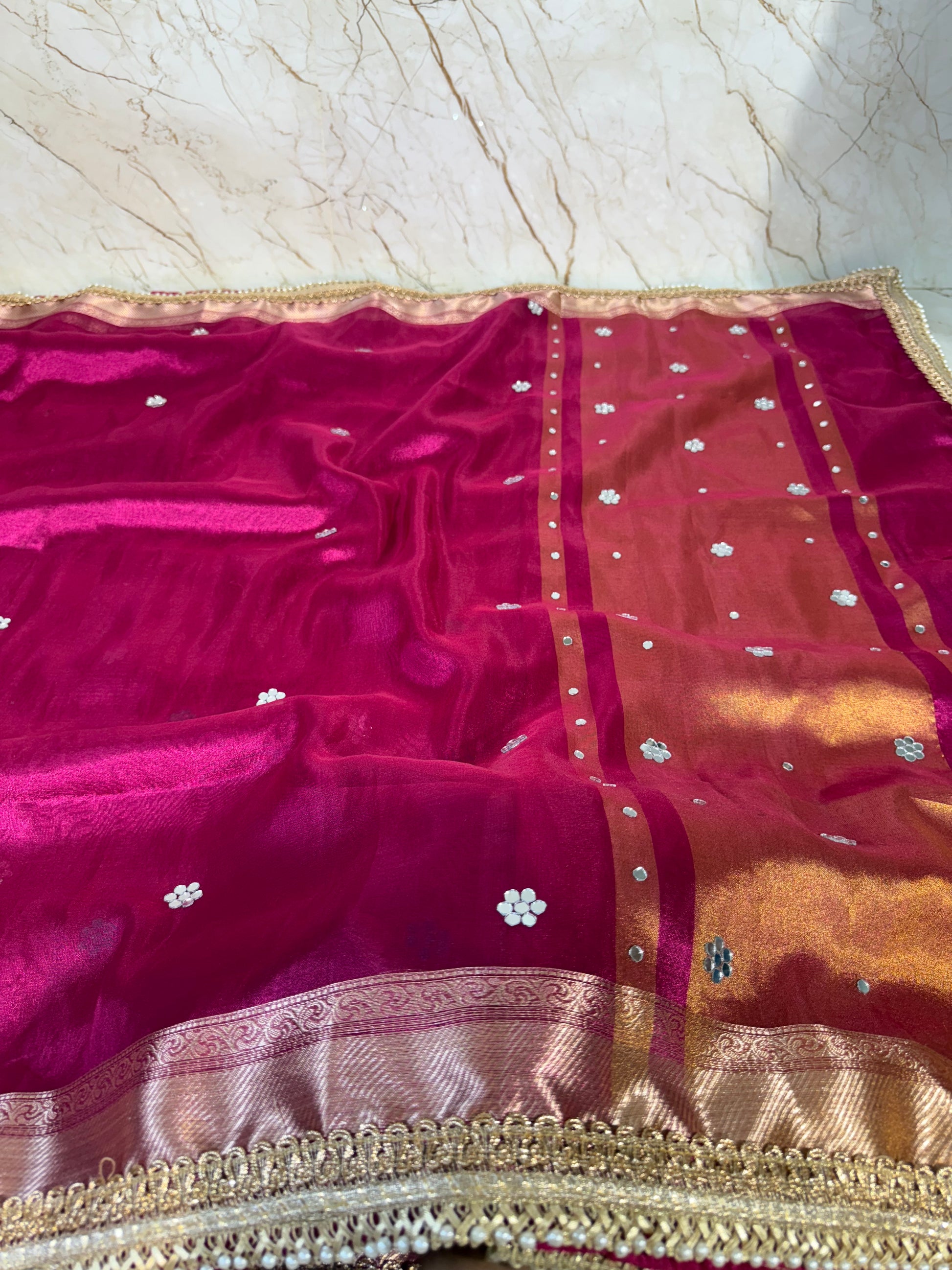 Step into the world of luxury and heritage with our exquisite Banarasi sarees, handwoven with the finest silk and adorned with intricate zari work. Originating from the holy city of Varanasi, these sarees have been a symbol of elegance, opulence, and tradition for centuries.