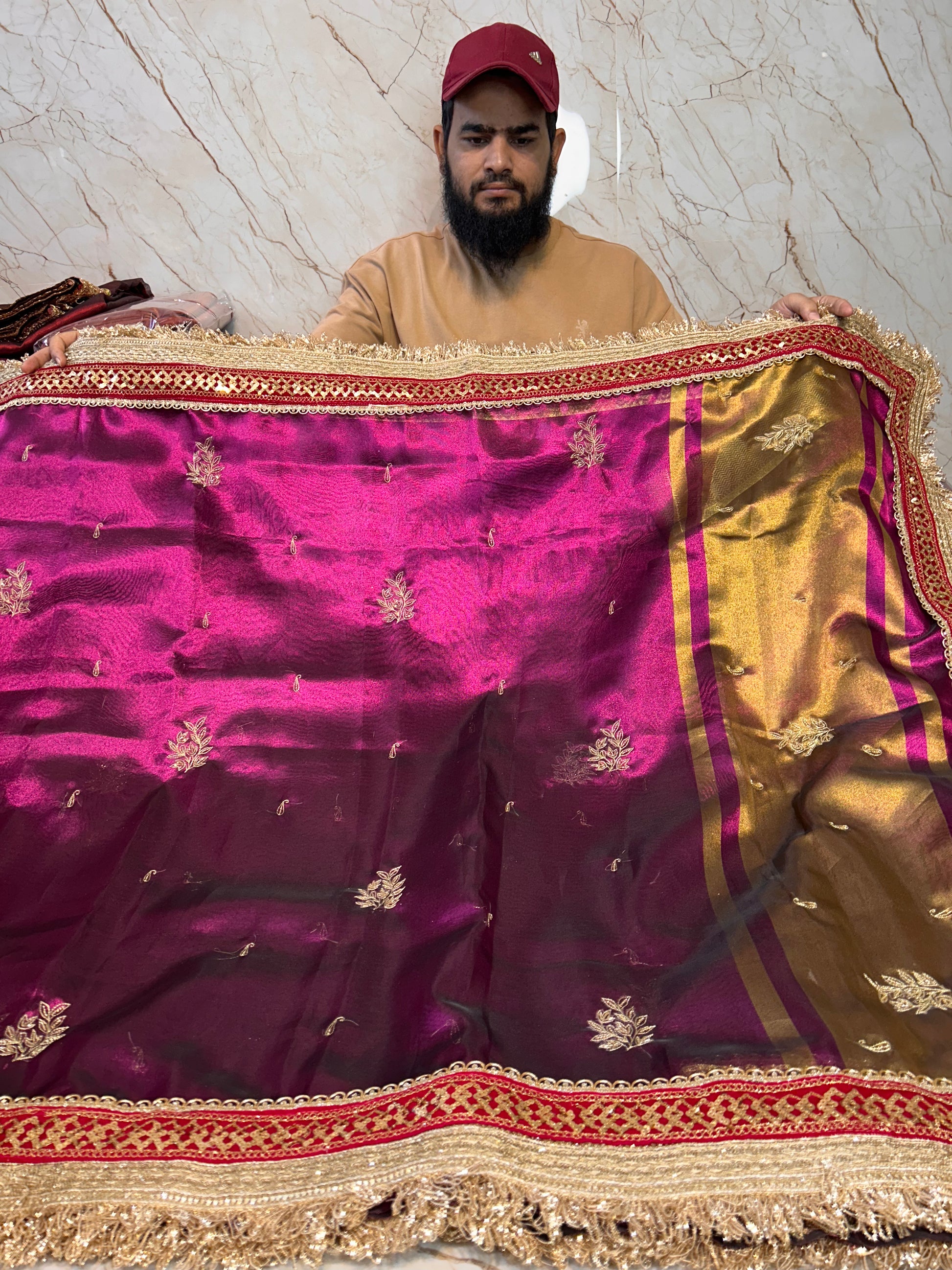 A Banarasi Tissue Zardozi Work Saree is a luxurious and intricate piece of traditional Indian attire, showcasing the rich craftsmanship and cultural heritage of India, especially from the city of Varanasi (Banaras). This saree combines the beauty of Banarasi fabric, tissue fabric, and the art of Zardozi embroidery, making it a stunning choice for weddings, festivals, or special occasions.