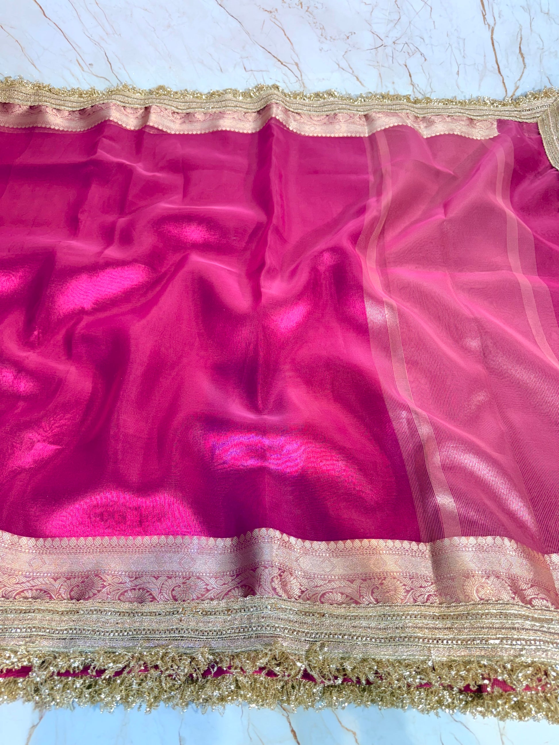 Step into the world of luxury and heritage with our exquisite Banarasi sarees, handwoven with the finest silk and adorned with intricate zari work. Originating from the holy city of Varanasi, these sarees have been a symbol of elegance, opulence, and tradition for centuries.